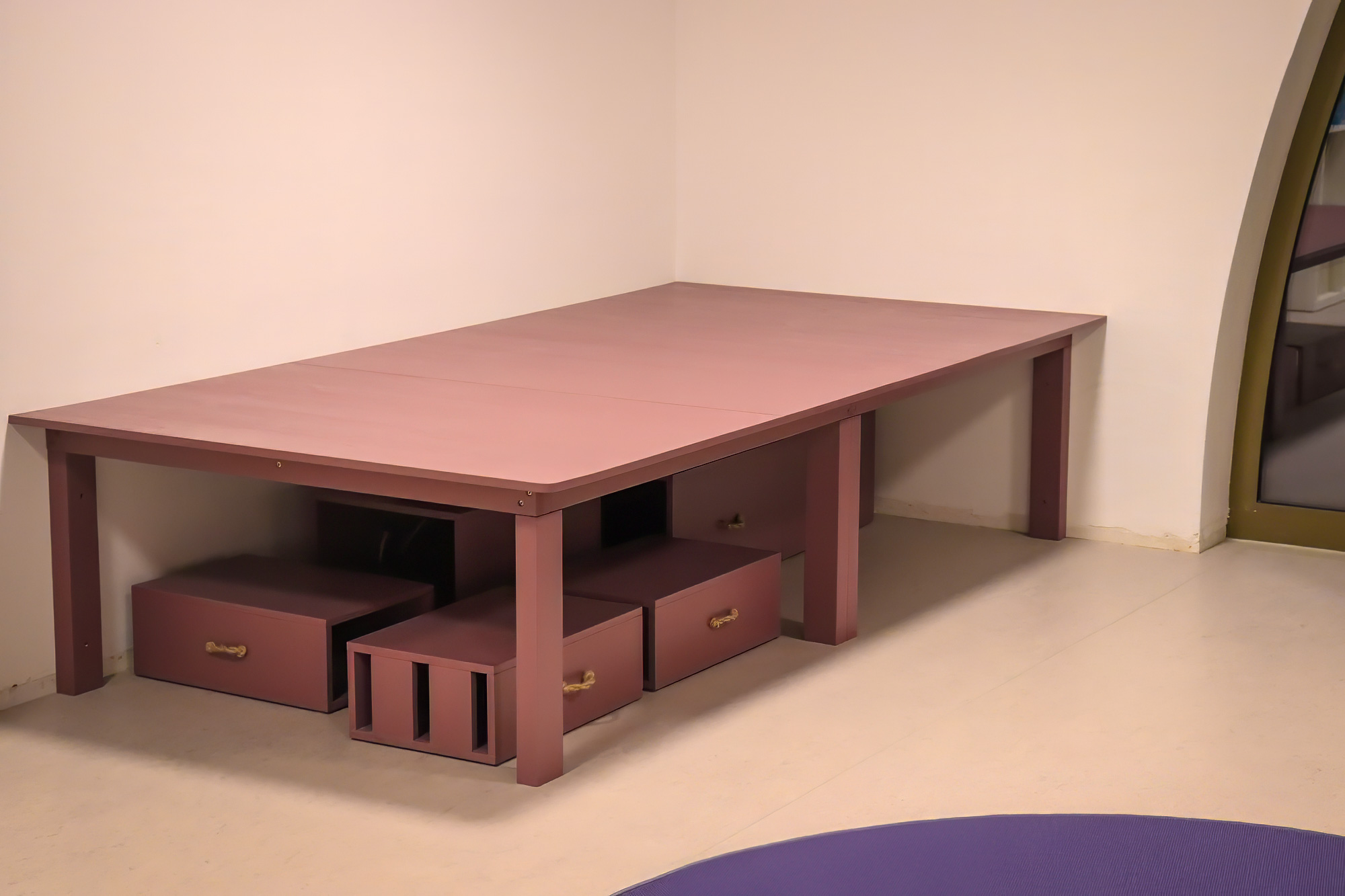 Podestlösungen mit integrierten, multifunktionalen Matratzenregalen