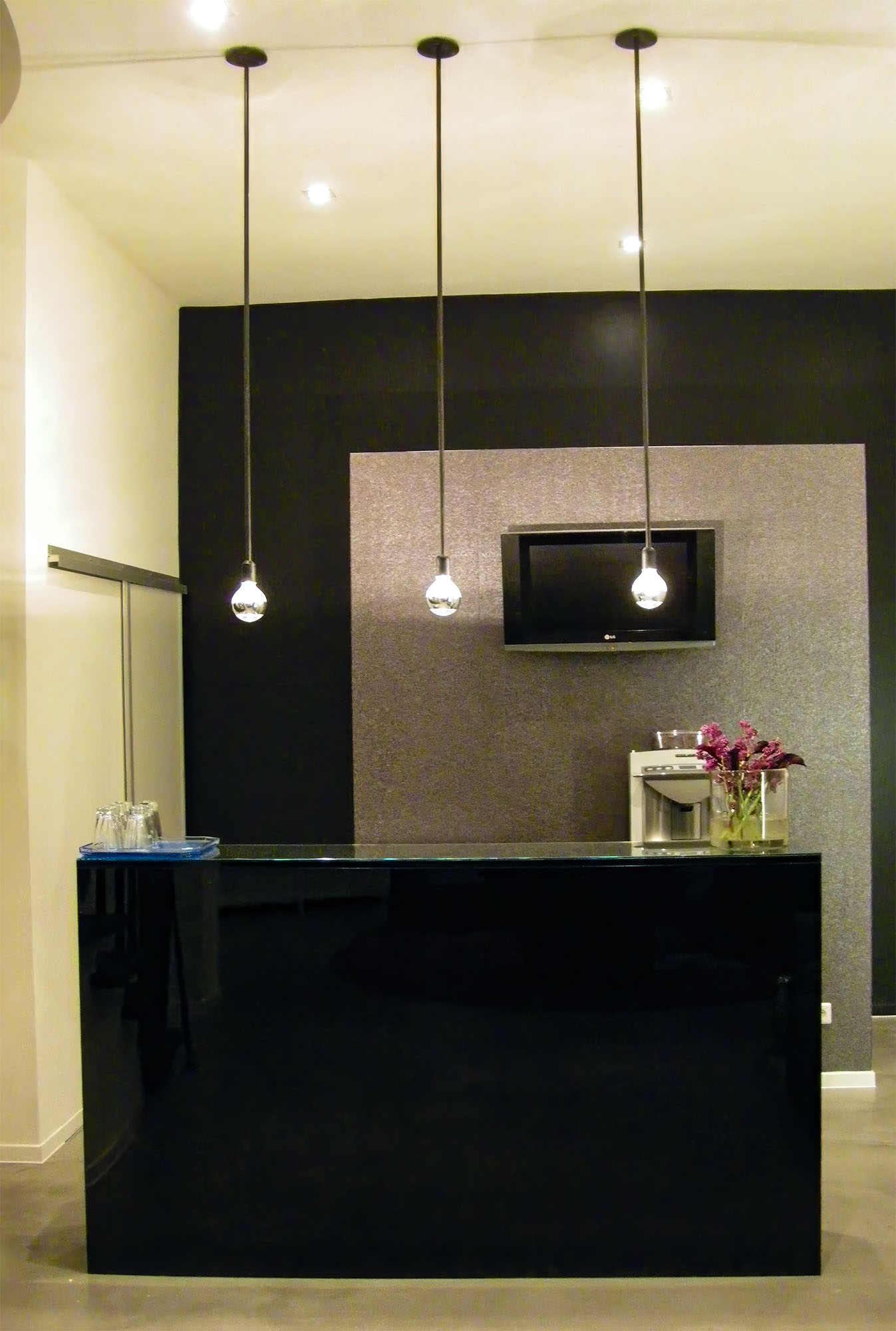 Skulptural gestalteter Tresen mit fließender Formgebung – entwickelt als prägendes Element im Eingangsbereich des Salons