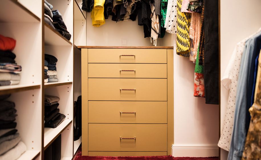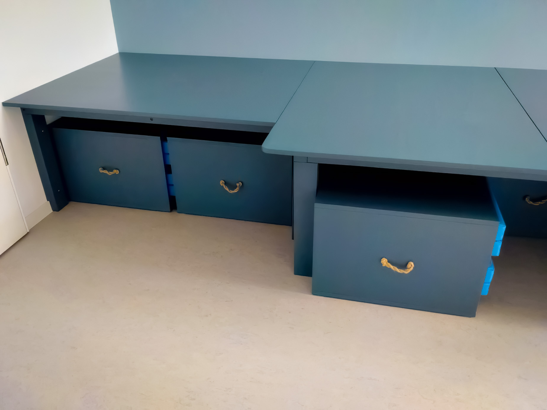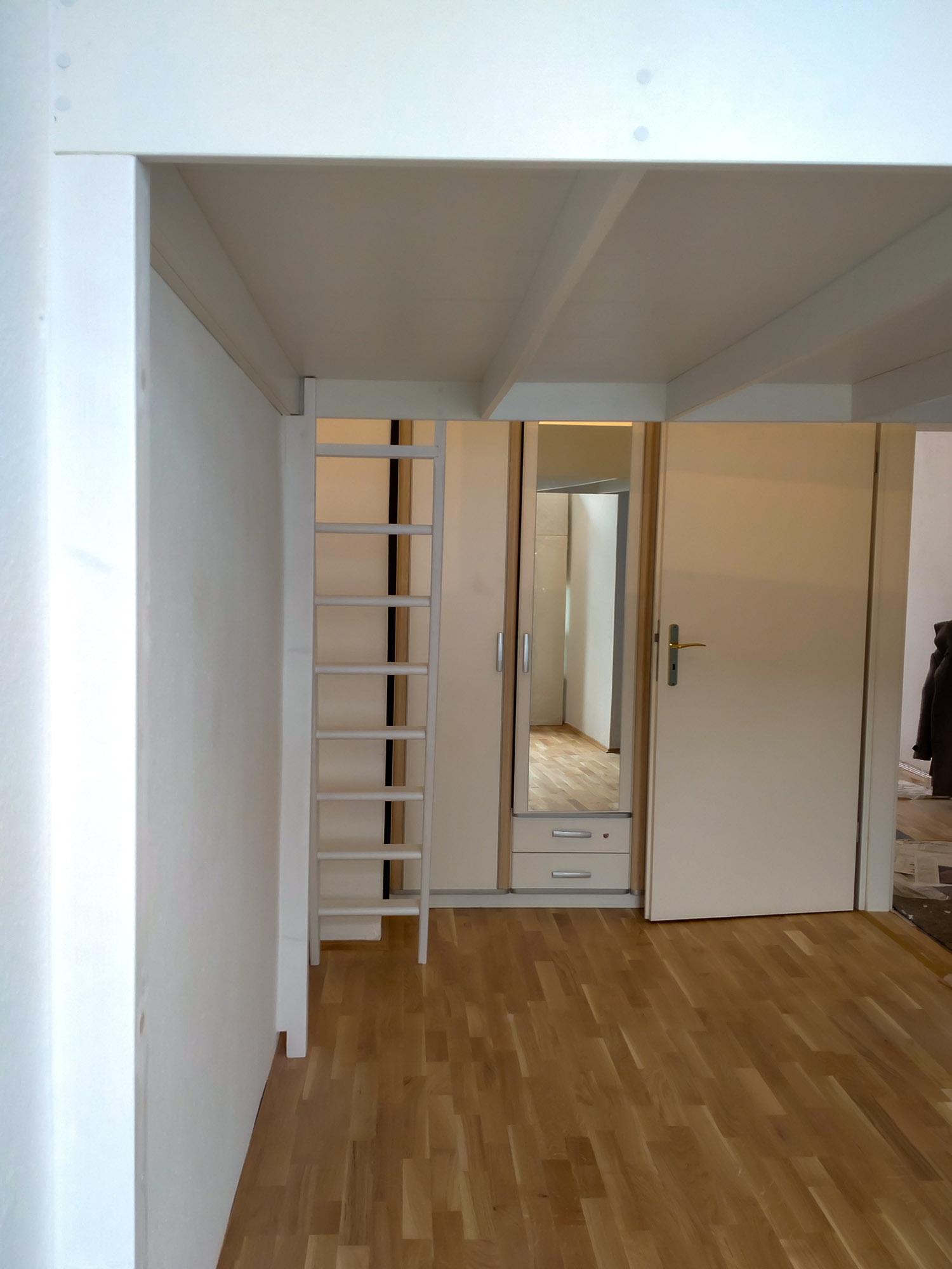Podestlösung mit integrierter Kleiderkammer, Regalen, Garderobe und Sideboard