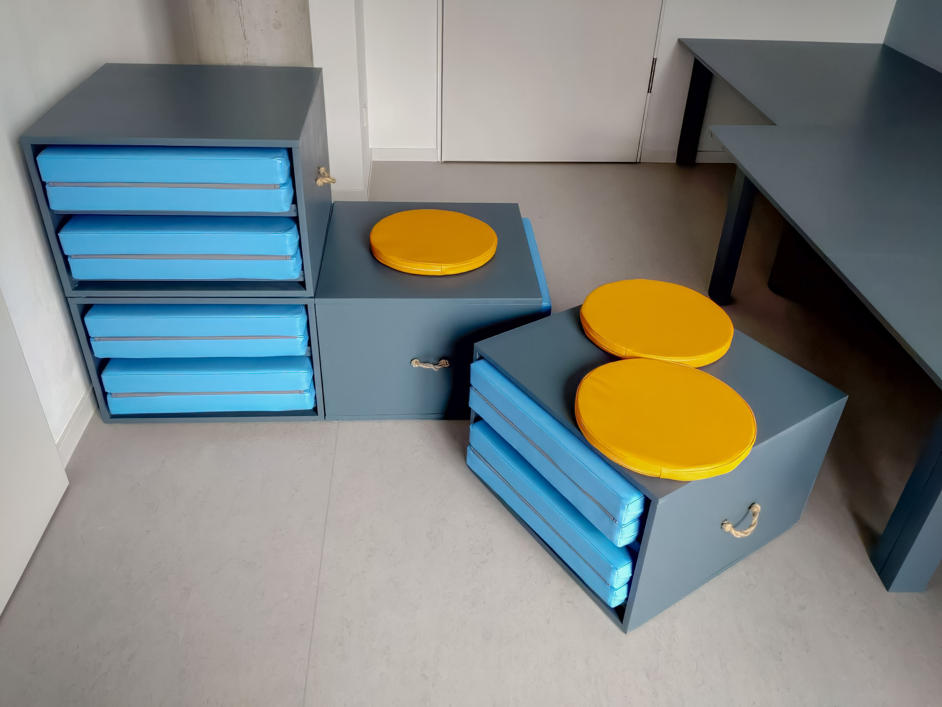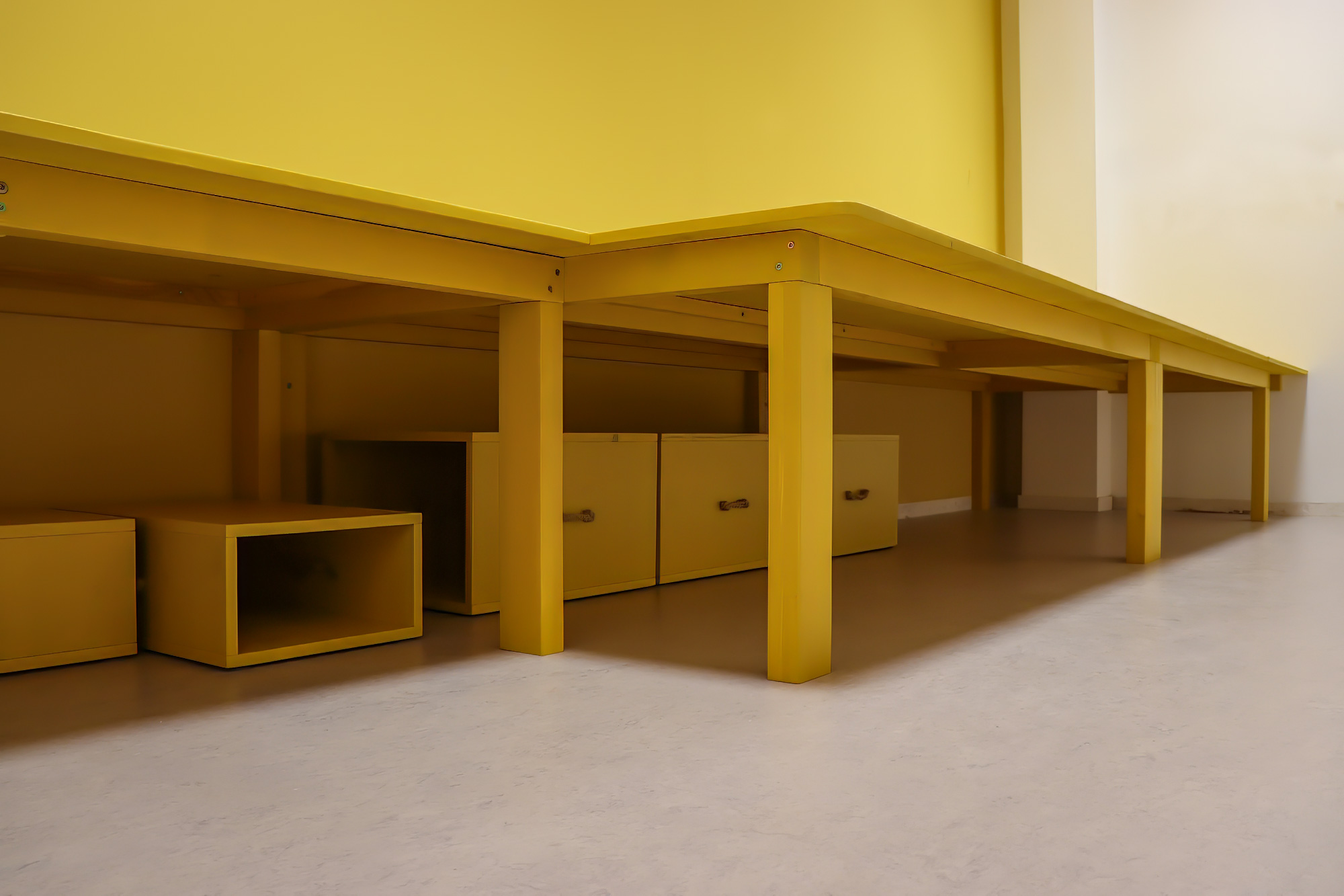 Podestlösungen mit integrierten, multifunktionalen Matratzenregalen