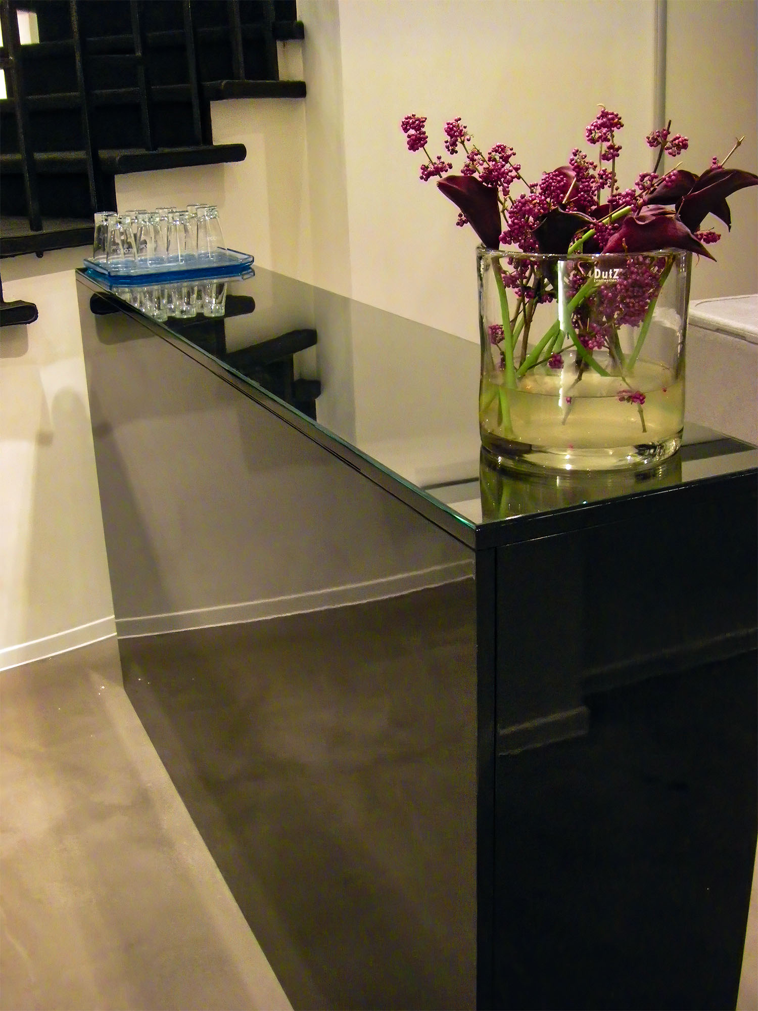 Puristisch gestalteter Tresen mit präzisen Linien und reflektierenden Oberflächen