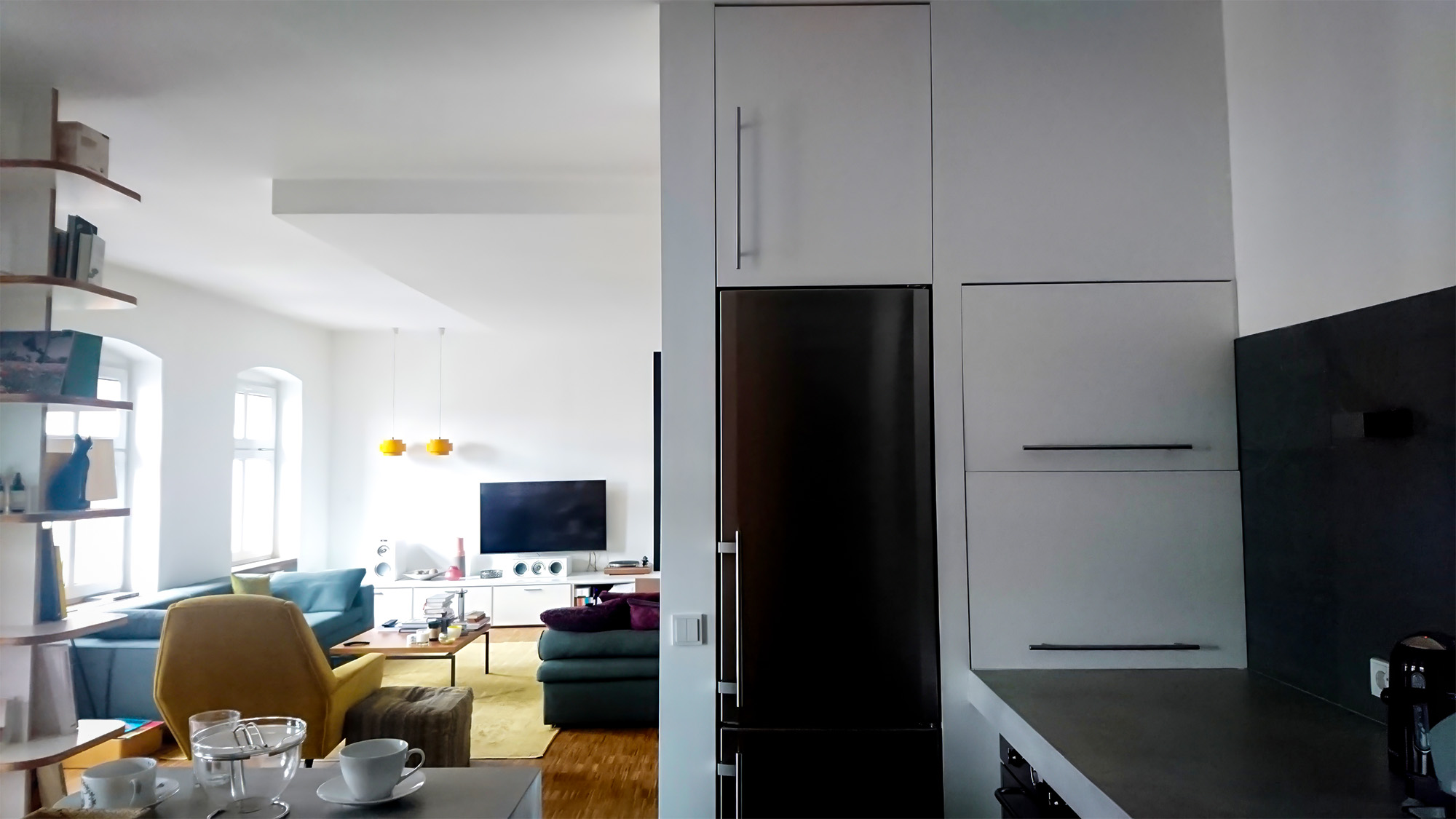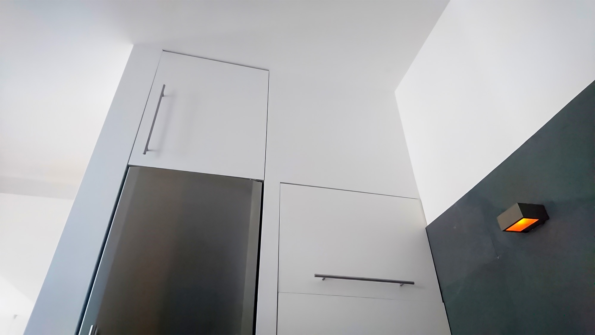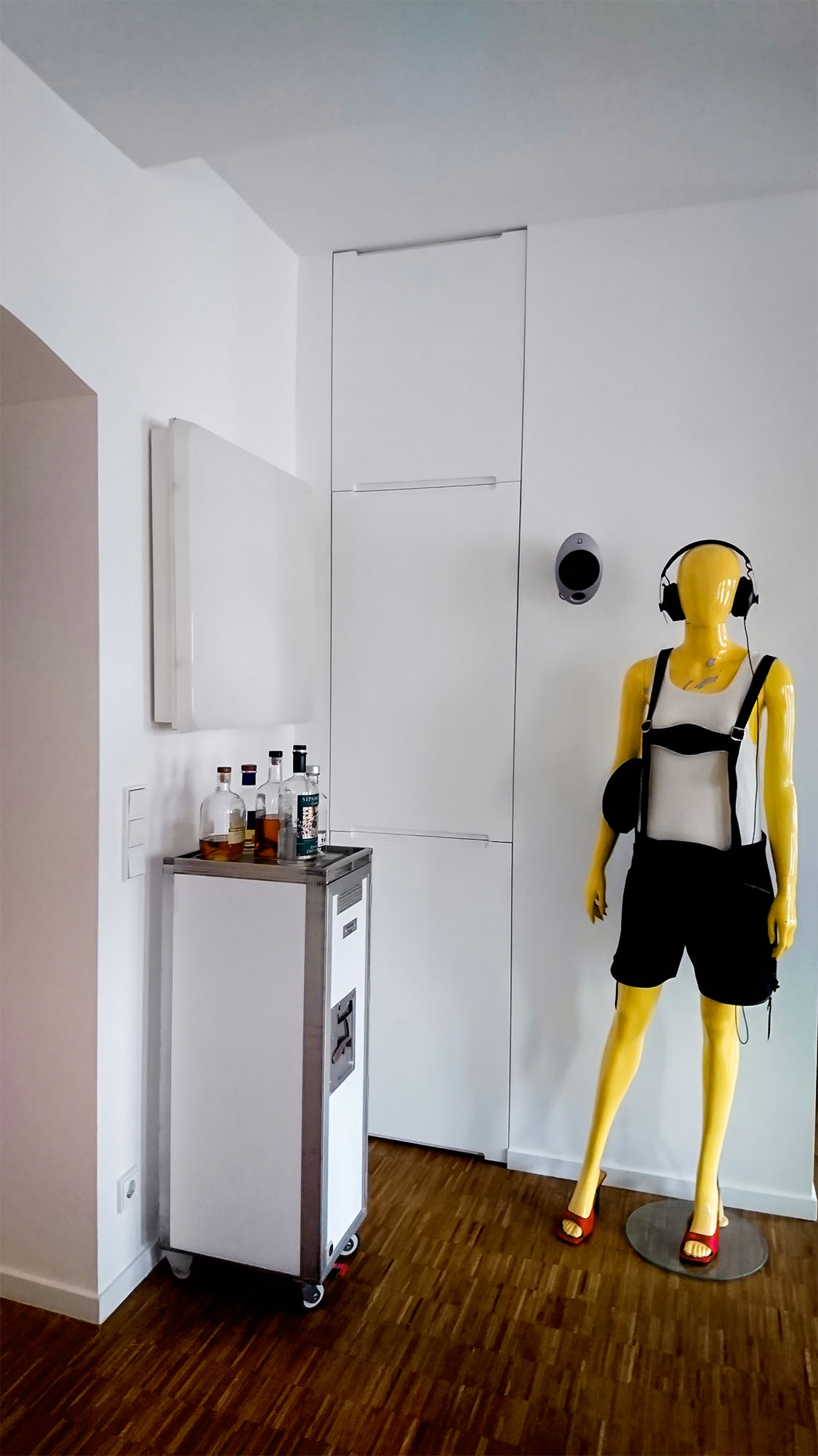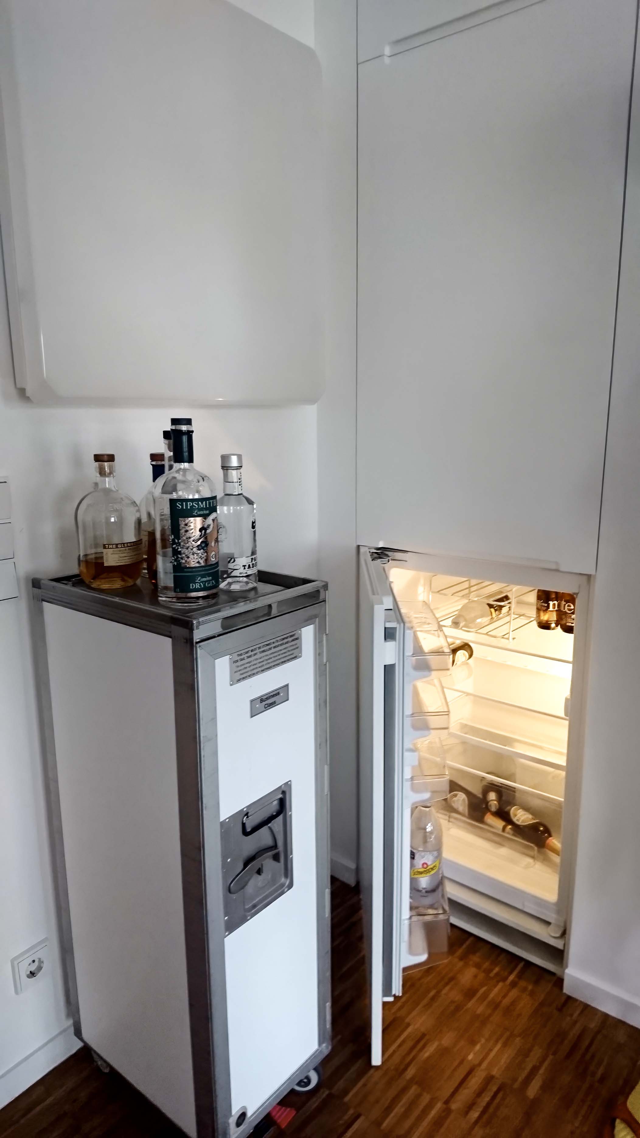 Einbaulösung mit Stauraum zu beiden Seiten, integriertem Kühlschrank, Minibar sowie Hochschränken mit Liftbeschlägen