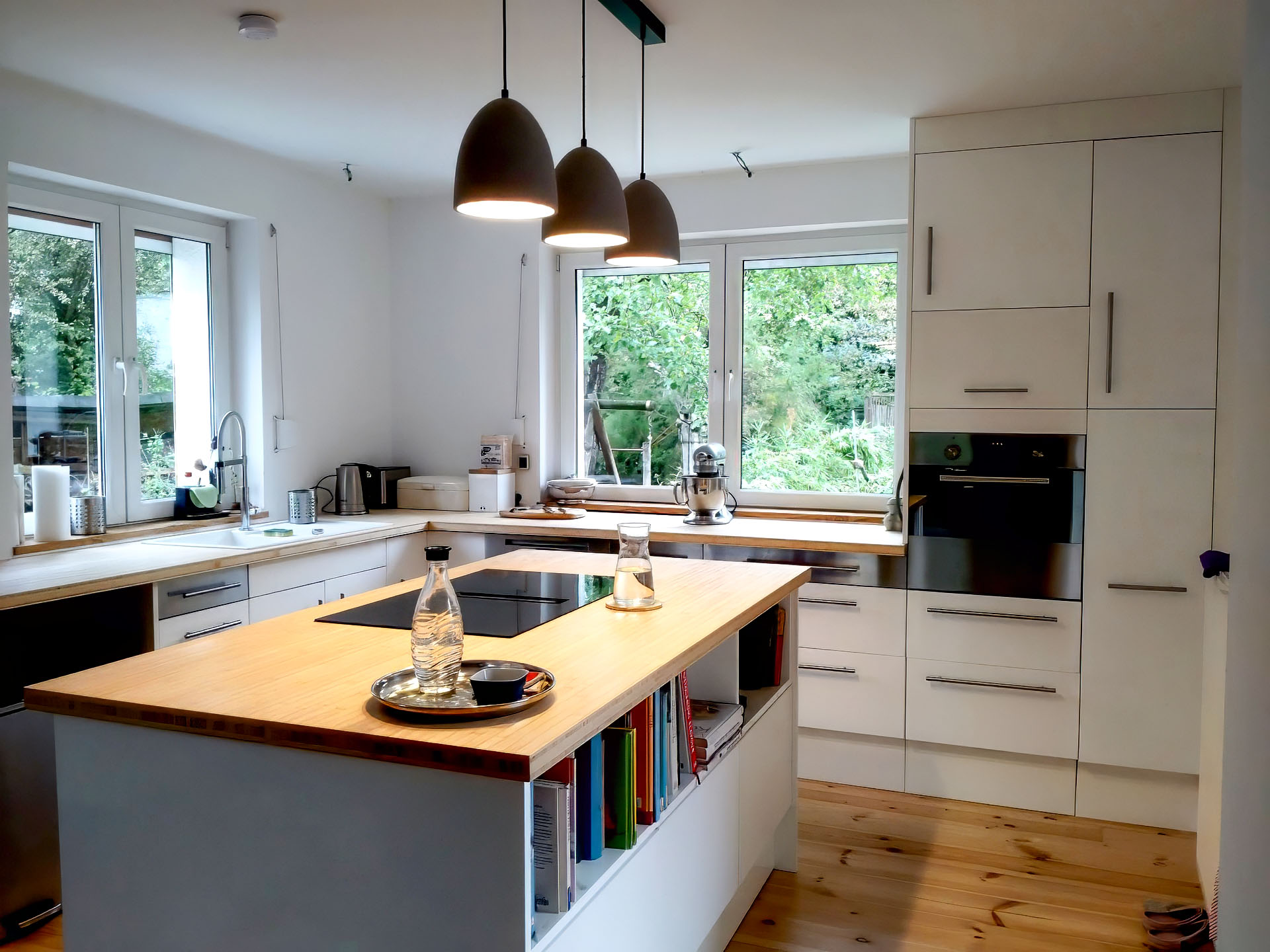 Neu strukturierte Küchenlösung mit erweitertem Stauraum durch Sockelschubkästen und einem integrierten Kochfeld in der Mittelinsel für optimierte Arbeitsabläufe