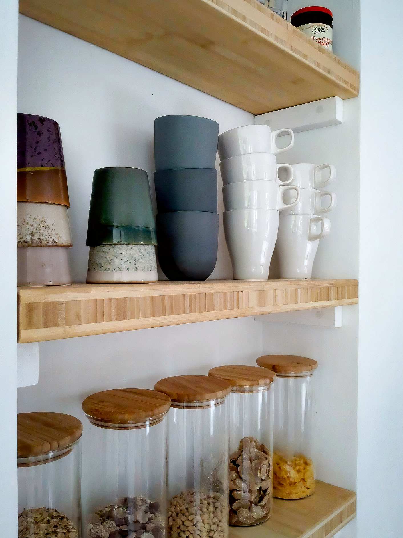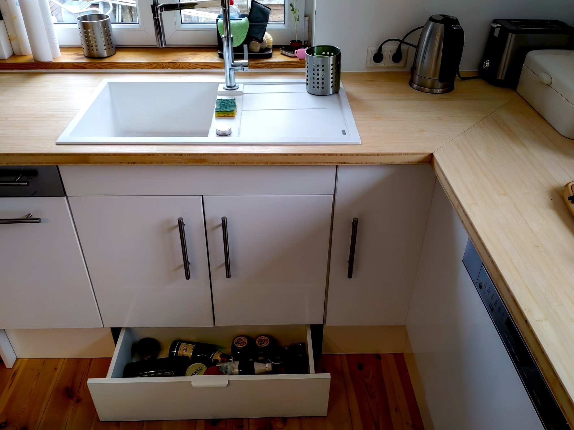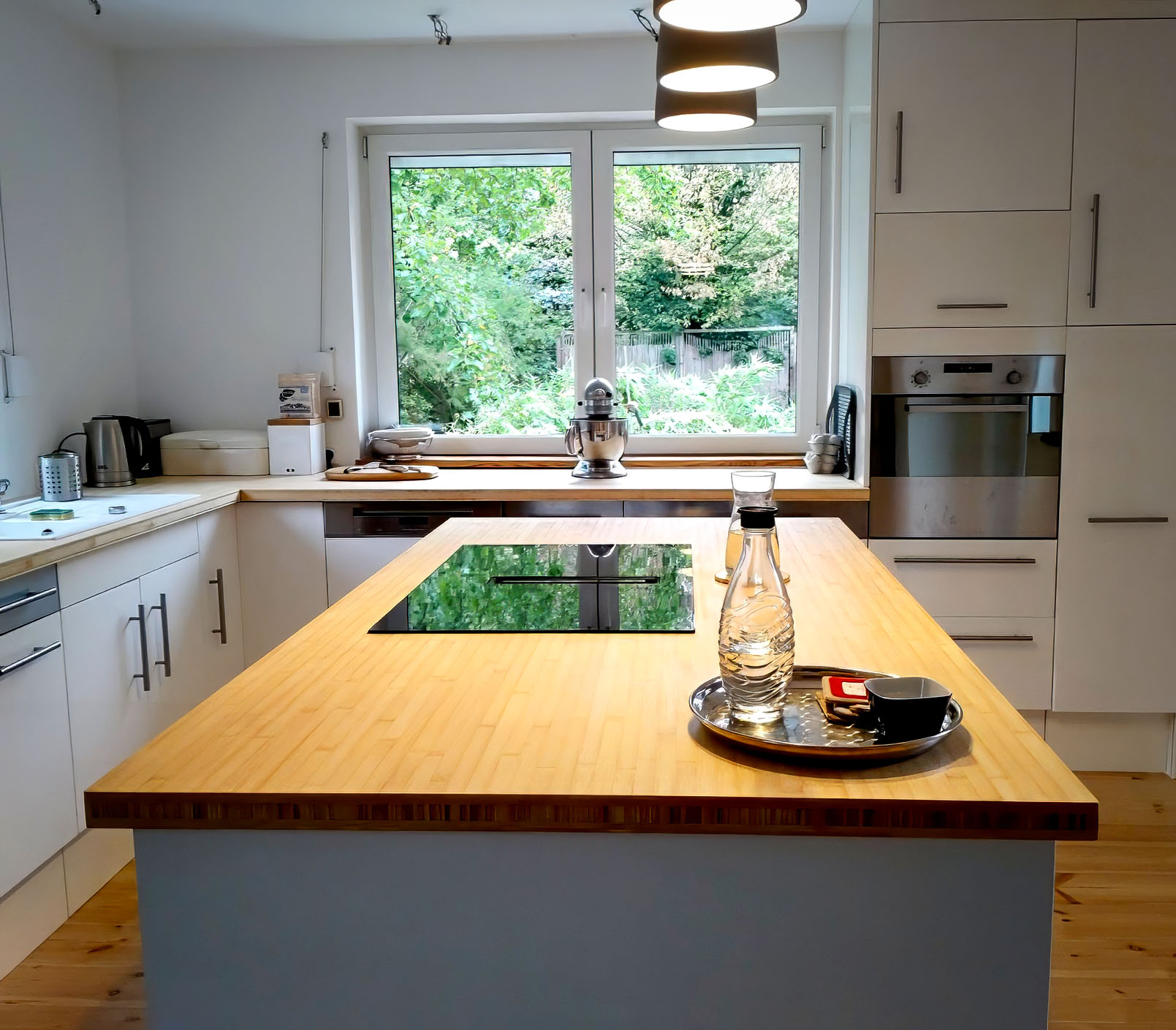 Material: Fronten aus beschichteter Spanplatte, Arbeitsflächen aus geöltem und gewachstem Bambus